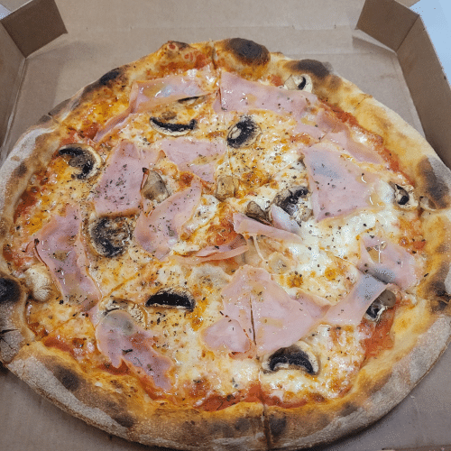 Sauce tomate, mozzarella, jambon, champignons, origan
